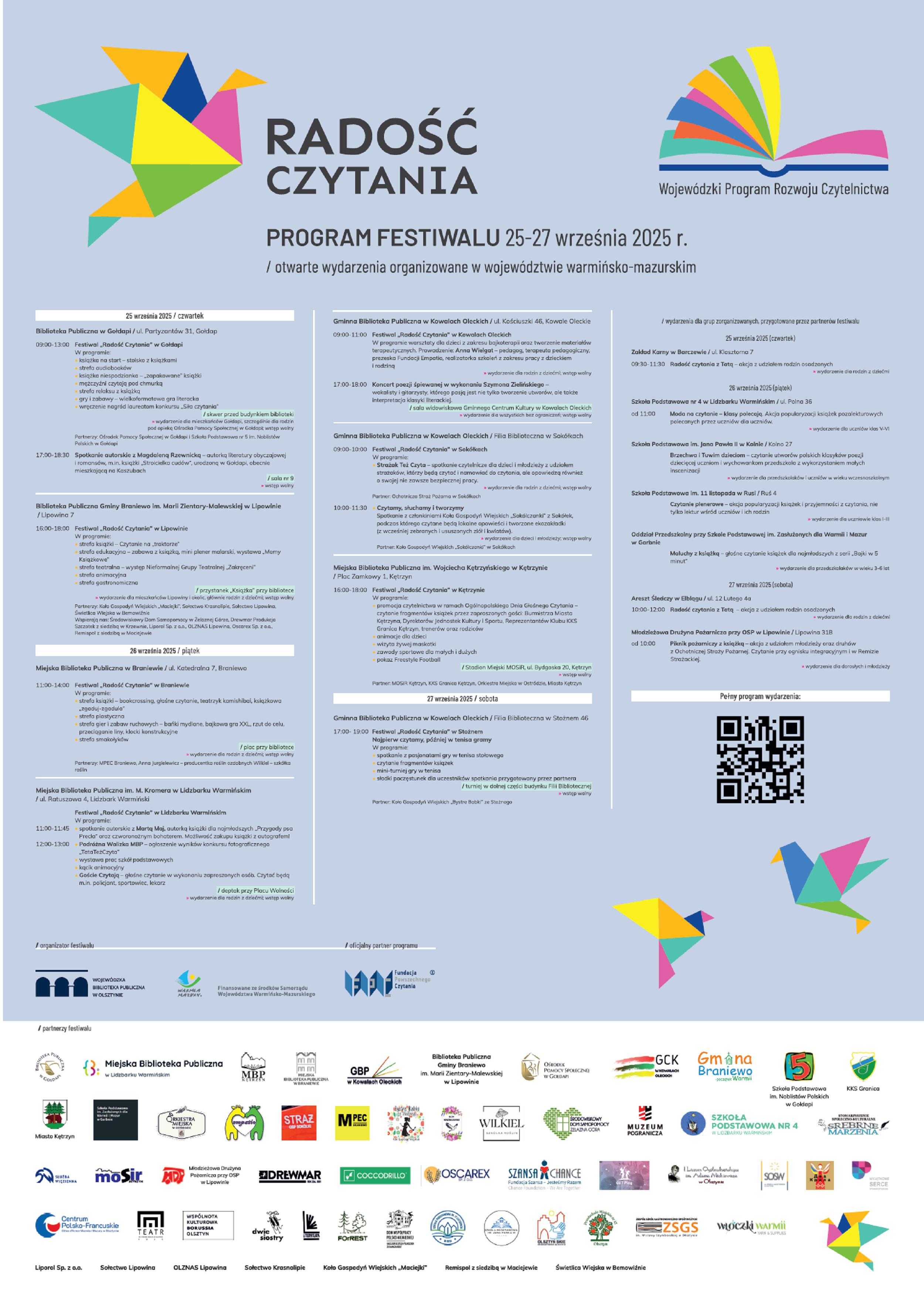 Festiwal „Radość Czytania” zbliża się wielkimi krokami. 26 i 27 września Gminna Biblioteka Publiczna w Kowalach Oleckich oraz Filie w Sokółkach i Stożnem zapraszają do wzięcia udziału w święcie czytania i książki organizowanego w ramach Wojewódzkiego Programu Rozwoju Czytelnictwa pod Patronatem Honorowym Marszałka Województwa Warmińsko-Mazurskiego. Informacje o wszystkich wydarzeniach organizowanych u nas jaki i na terenie całego województwa znadują się na plakacie oraz w Programie Festiwalu.