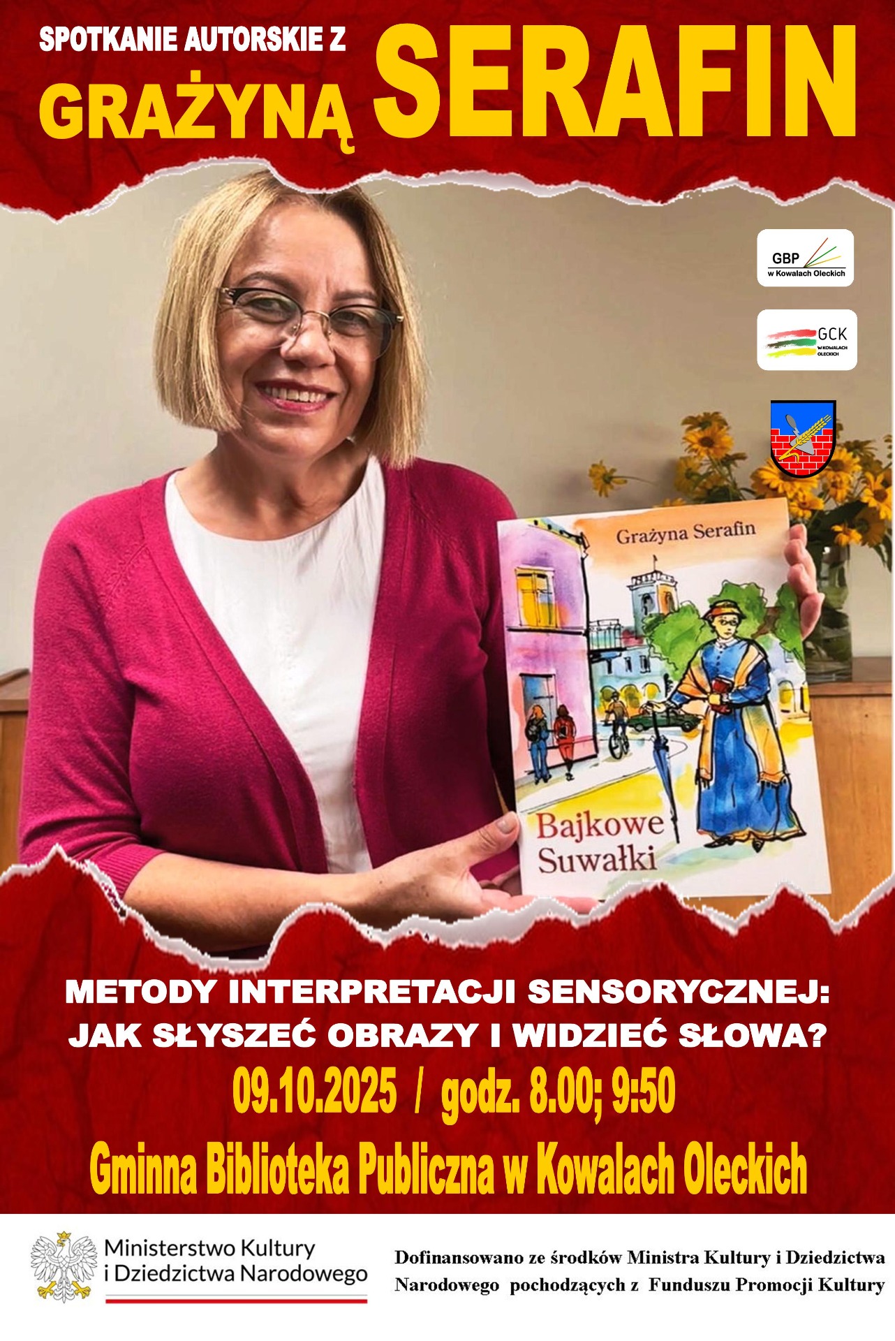 Gminne Centrum Kultury wraz z Gminną Biblioteką Publiczną w Kowalach Oleckich zapraszają na spotkanie autorskie z Grażyną Serafin "Metody interpretacji sensorycznej: Jak słyszeć obrazy i widzieć słowa?". Wydarzenie odbędzie się w dniu 09.10.2025 roku w Gminnej Bibliotece Publicznej w Kowalach Oleckich (ul. Kościuszki 46, 19-420 Kowale Oleckie). Początek warsztatów - godz. 8:00 (grupa I), 9:50 (grupa II).