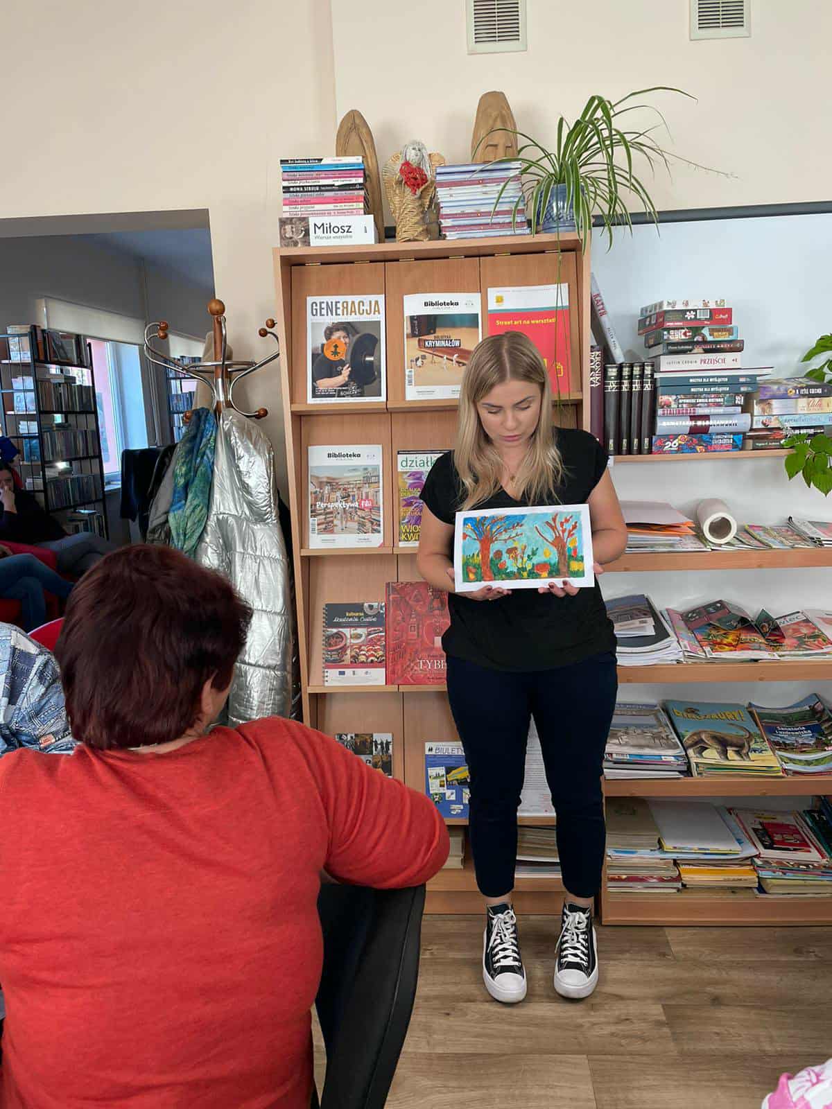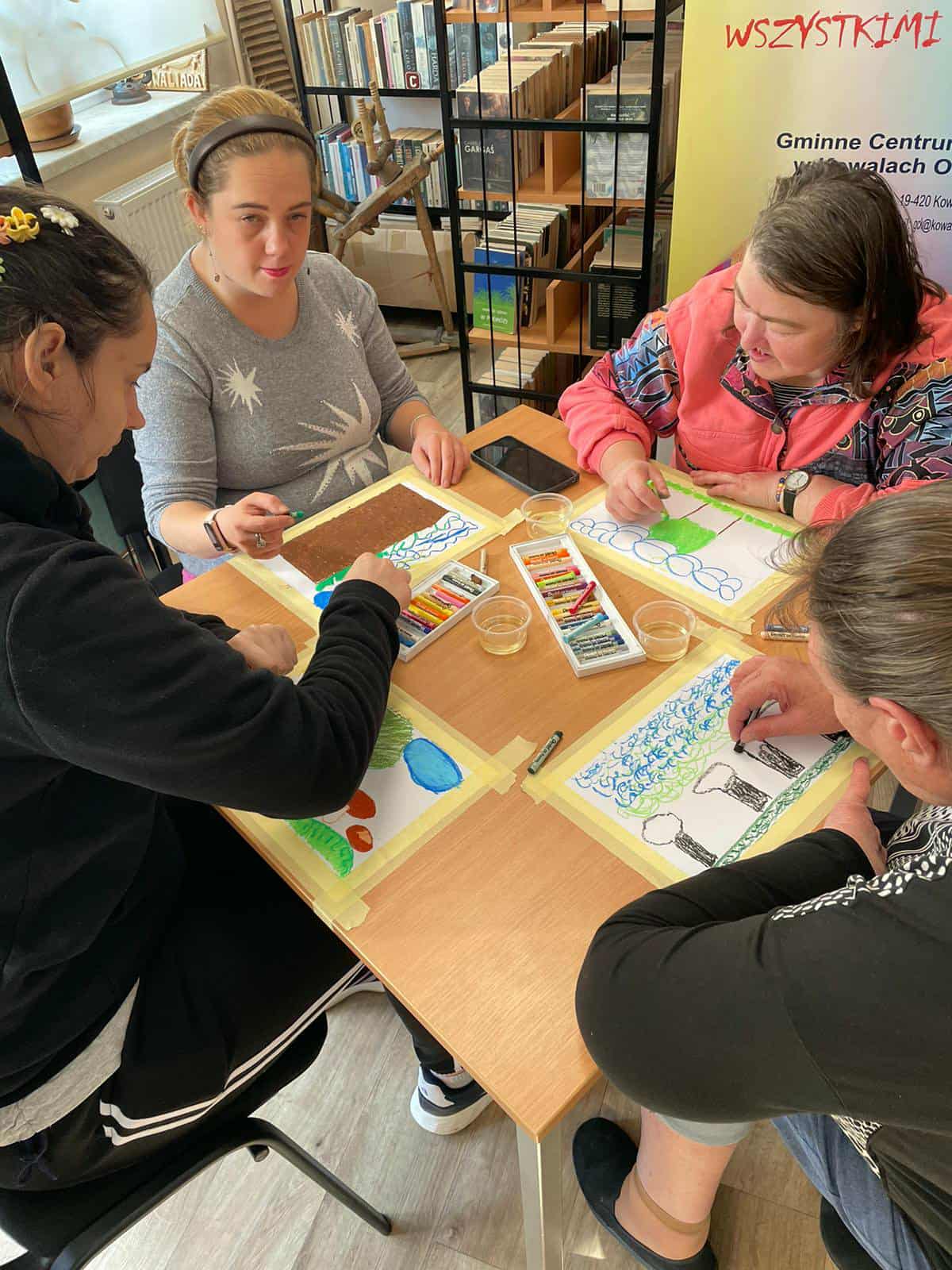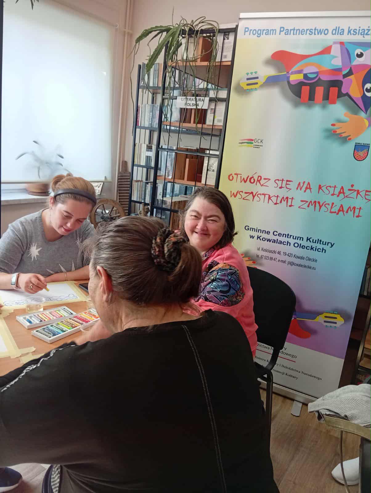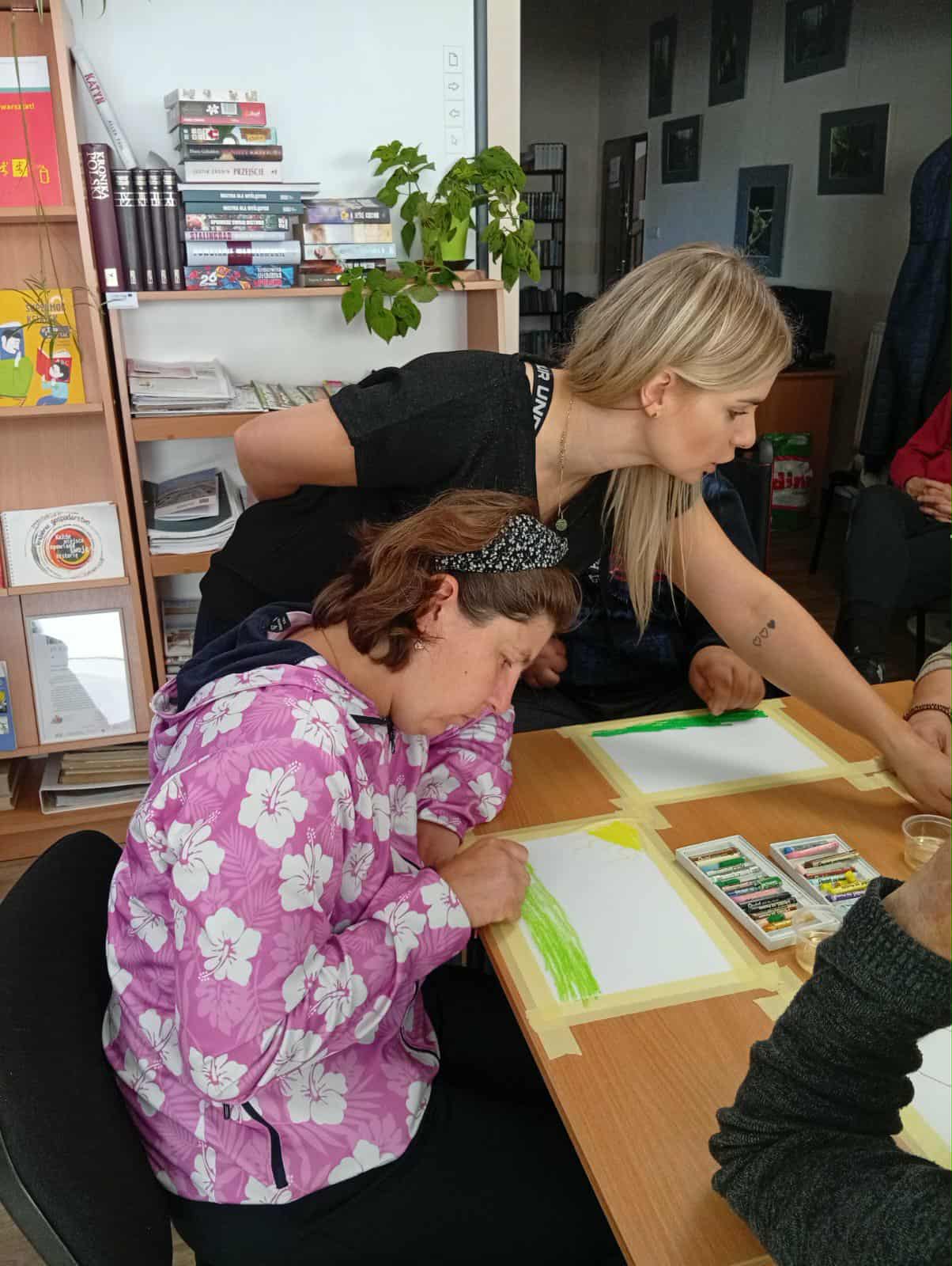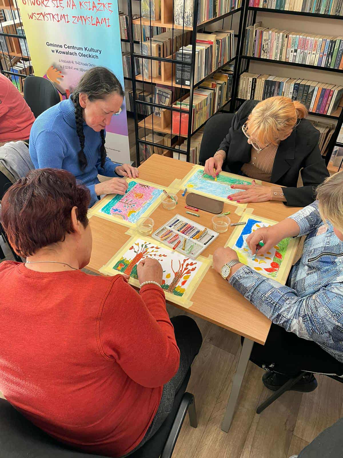 3 października w Gminnej Bibliotece Publicznej w Kowalach Oleckich, a skierowane były do uczestników tutejszego Środowiskowego Domu Samopomocy . Po wysłuchaniu dwóch różnych utworów poetyckich, które przepełnione były kolorami, muzyką, nastrojem, bogactwem flory i fauny, rozpoczęła się rozmowa o emocjach jakie wywołały te wiersze. Odbiór był bardzo pozytywny, a emocje podobne, każdy opowiadał co widział, słyszał i czuł podczas słuchania. Gdy słowa ucichły przyszedł czas na przeniesienie tych wrażeń na papier. W ruch poszły kredki i palce, które rozprowadzały po kolorach olej. Powstały piękne prace, które zachwycały oglądających i budziły zdziwienie wśród samych wykonawców, a mianowicie, że tak udało im się wydobyć z wysłuchanych wierszy, piękno jesieni. Z uśmiechem na ustach i radością, a nie jesiennym smutkiem, każdy ze swoim dziełem, opuszczali bibliotekę.