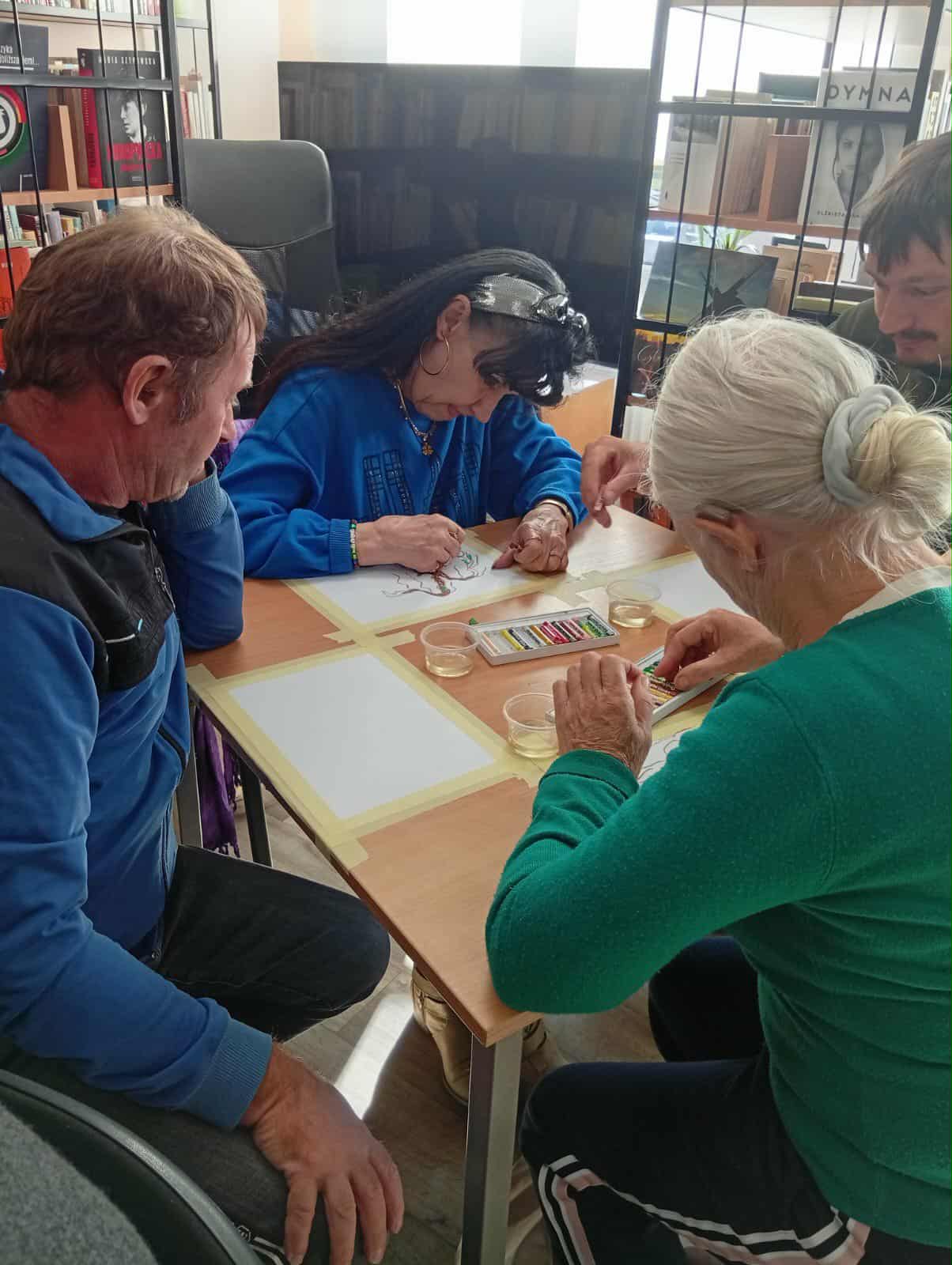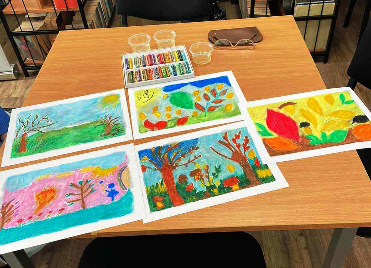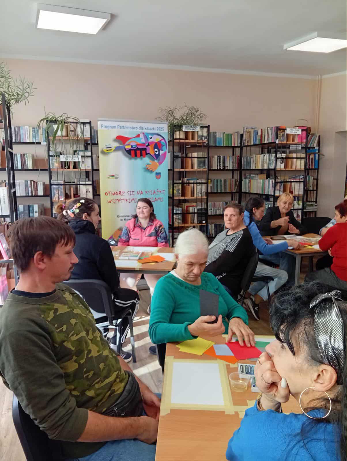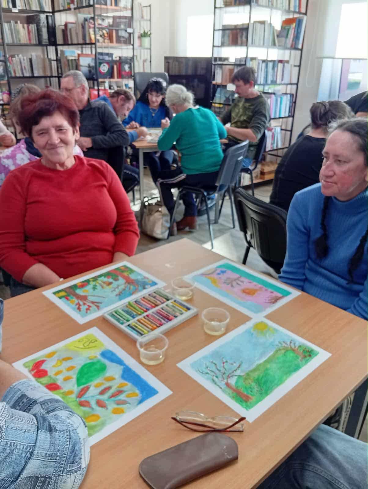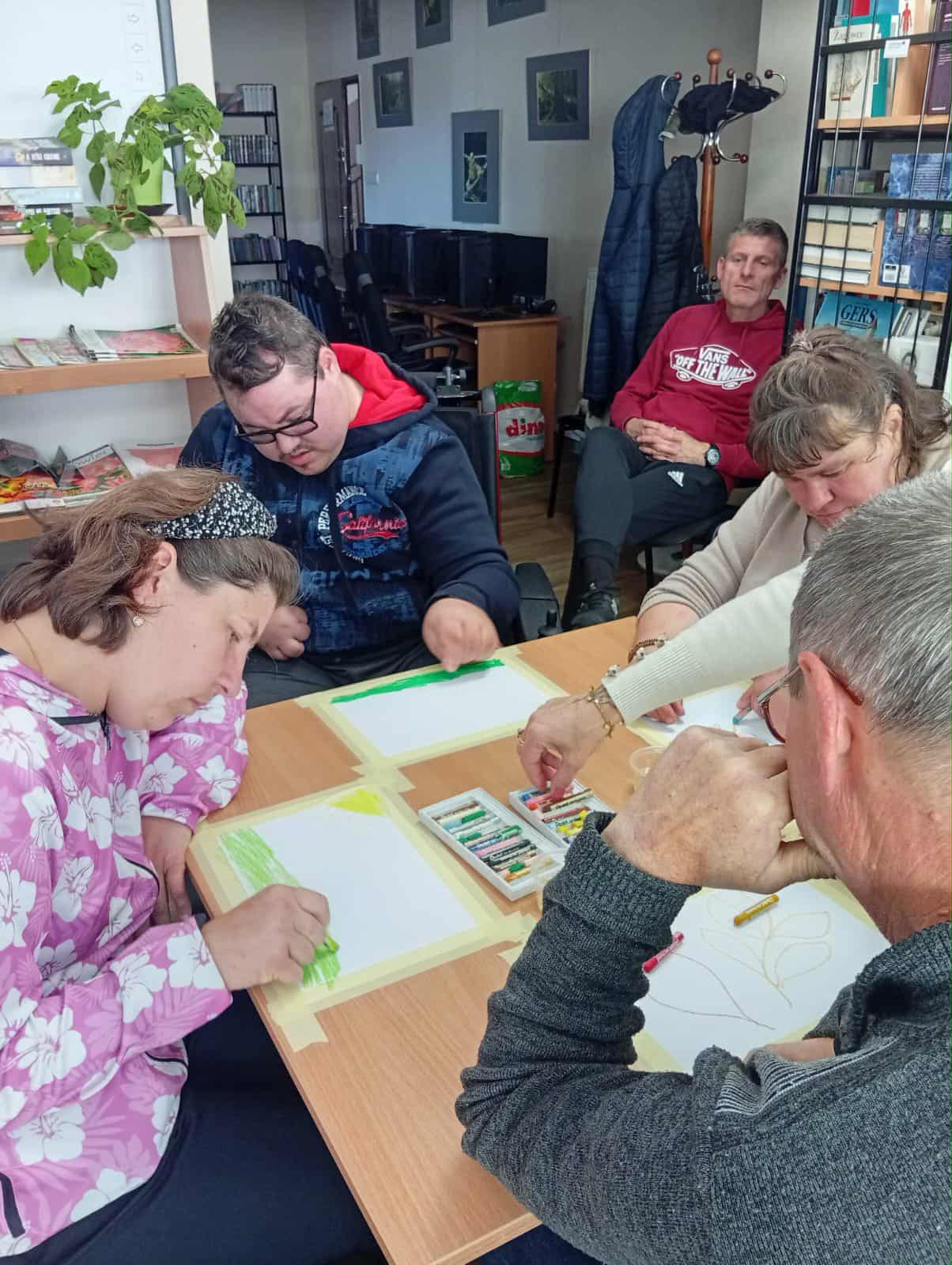 3 października w Gminnej Bibliotece Publicznej w Kowalach Oleckich, a skierowane były do uczestników tutejszego Środowiskowego Domu Samopomocy . Po wysłuchaniu dwóch różnych utworów poetyckich, które przepełnione były kolorami, muzyką, nastrojem, bogactwem flory i fauny, rozpoczęła się rozmowa o emocjach jakie wywołały te wiersze. Odbiór był bardzo pozytywny, a emocje podobne, każdy opowiadał co widział, słyszał i czuł podczas słuchania. Gdy słowa ucichły przyszedł czas na przeniesienie tych wrażeń na papier. W ruch poszły kredki i palce, które rozprowadzały po kolorach olej. Powstały piękne prace, które zachwycały oglądających i budziły zdziwienie wśród samych wykonawców, a mianowicie, że tak udało im się wydobyć z wysłuchanych wierszy, piękno jesieni. Z uśmiechem na ustach i radością, a nie jesiennym smutkiem, każdy ze swoim dziełem, opuszczali bibliotekę.