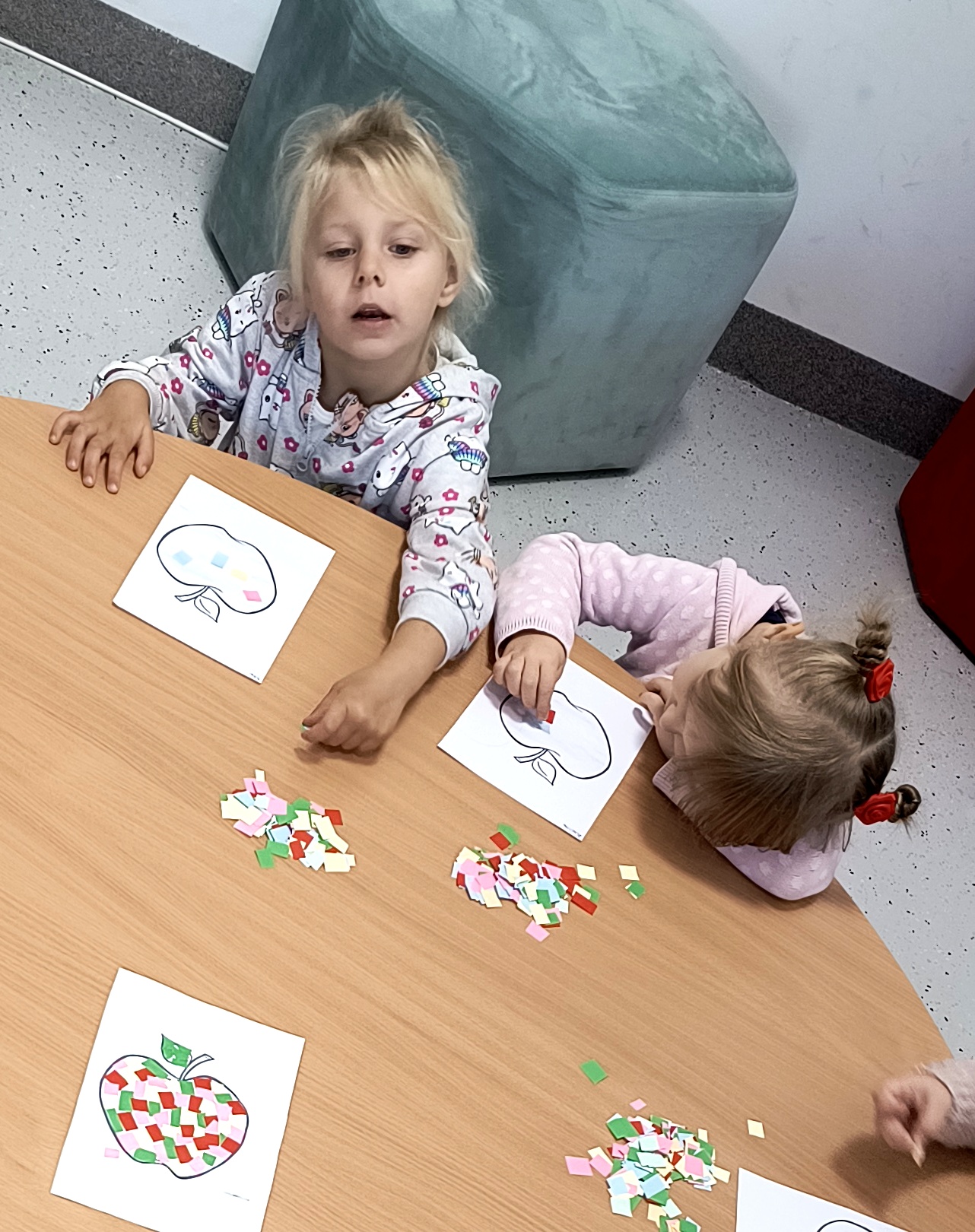 Następnie odbyły się zajęcia plastyczne. Dzieci ćwiczyły „jesienne pisanie”, a później wyklejały jabłka kolorowymi kartkami. Powstały piękne, barwne prace, które wniosły do biblioteki dużo jesiennego klimatu. Na zakończenie przedszkolaki obejrzały film edukacyjny „Ala i dary jesieni”, dzięki któremu dowiedziały się, jakie skarby przynosi ta pora roku i jak możemy je wykorzystać.