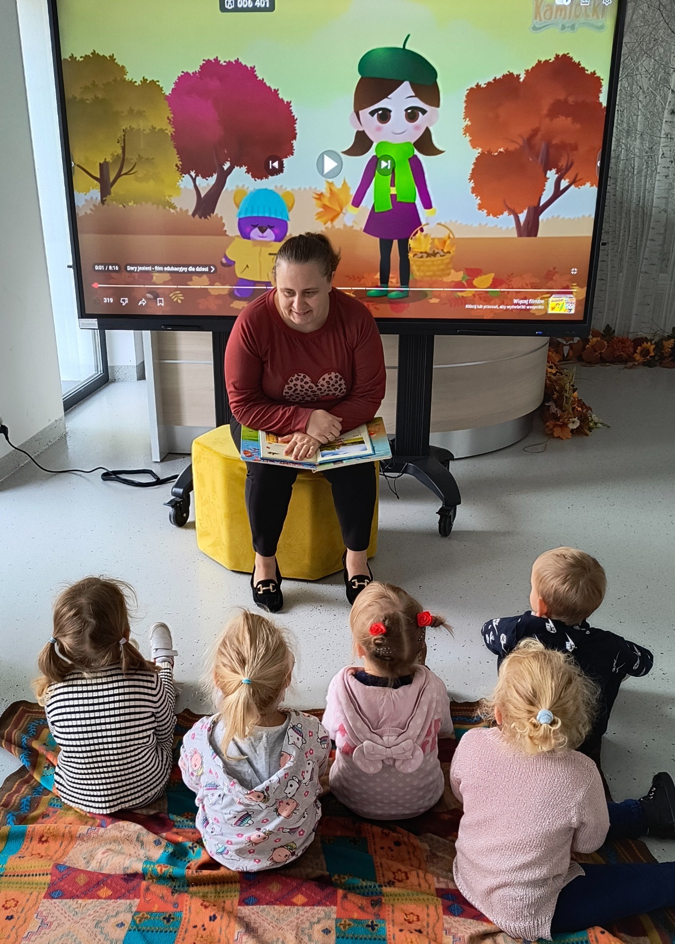 Na początku dzieci wysłuchały wierszy o jesieni. Wspólne czytanie pozwoliło im przenieść się w świat złocistych liści, soczystych owoców i jesiennych darów przyrody. Przedszkolaki chętnie odpowiadały na pytania, dzieliły się swoimi spostrzeżeniami i opowiadały, co najbardziej lubią w tej porze roku.