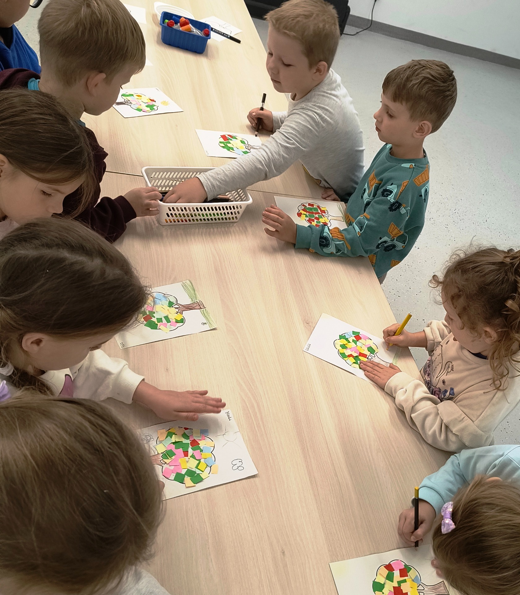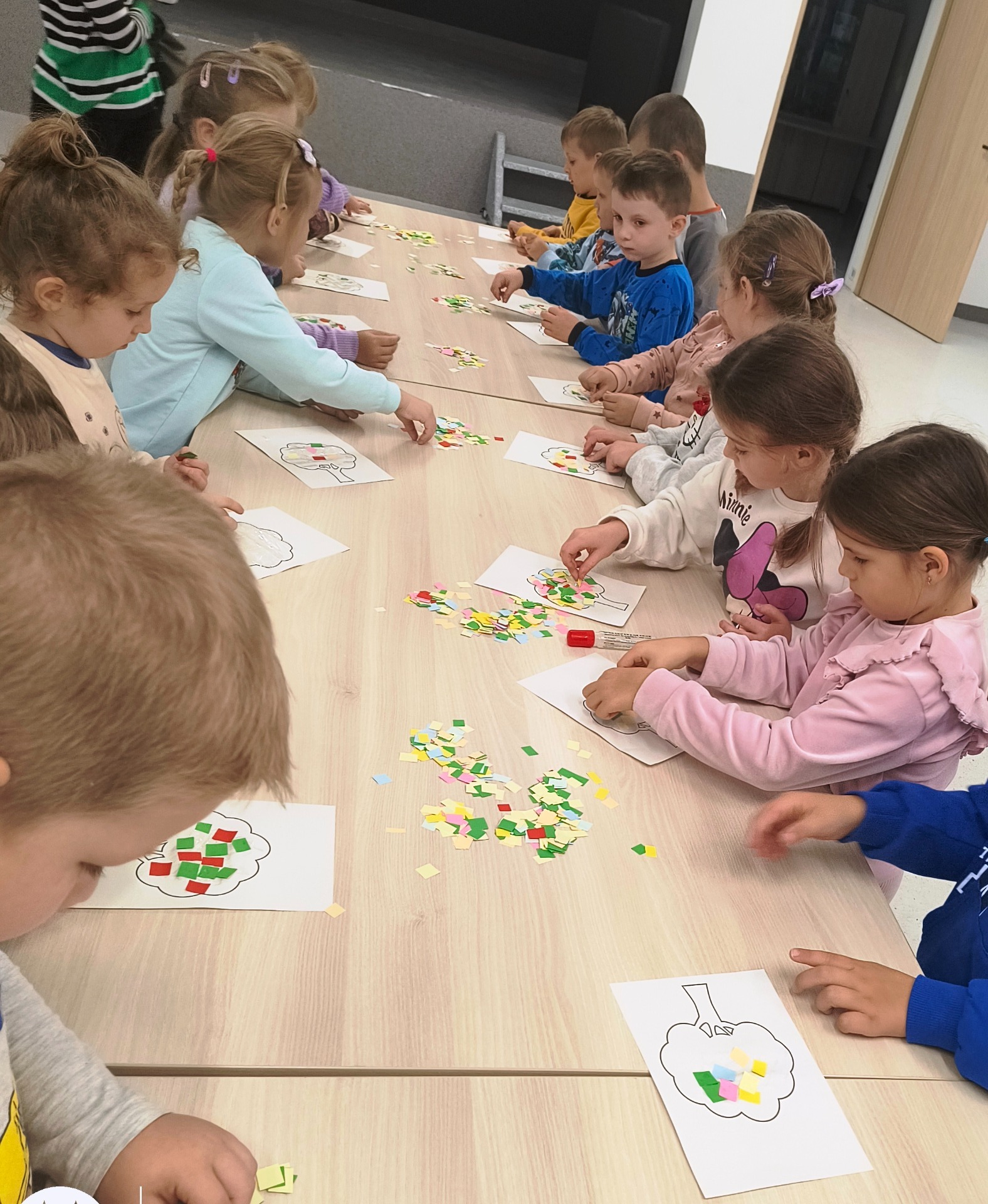 Na początku dzieci zapoznały się z biblioteką i jej księgozbiorem. Dowiedziały się, czym jest biblioteka, jak można wypożyczać książki i dlaczego warto czytać. Następnie odbyło się głośne czytanie wierszyków ze zbioru „Zwierzaki z abecadła cudaki”. Wesołe rymowanki o zwierzętach wzbudziły wiele radości i uśmiechu. Dzieci z zaangażowaniem słuchały, odgadywały bohaterów wierszyków. Na zakończenie uczestnicy wzięli udział w zajęciach plastycznych, podczas których każdy uczestnik wyklejał drzewo z papierowych kartek. Powstały piękne prace – „Drzewa czytelników” – symbolizująca wyobraźnię i radość z obcowania z książką.
