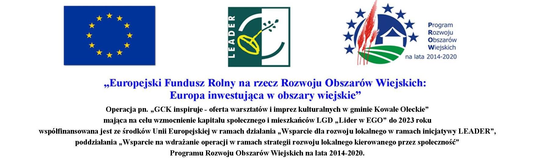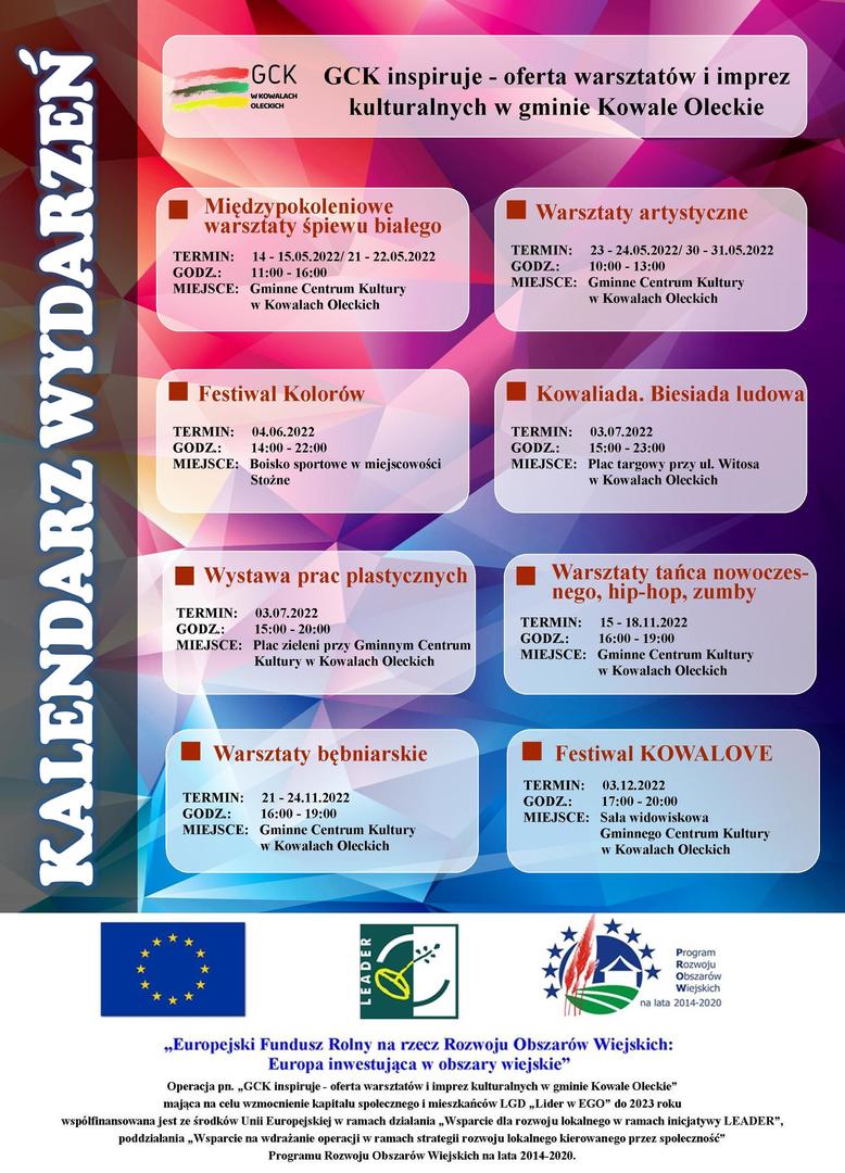 Serdecznie zapraszamy do zapoznania się z kalendarzem wydarzeń zaplanowanych w ramach projektu „GCK inspiruje - oferta warsztatów i imprez kulturalnych w gminie Kowale Oleckie”. Zadanie współfinansowane jest ze środków Unii Europejskiej w ramach działania „Wsparcie dla rozwoju lokalnego w ramach inicjatywy LEADER”, poddziałania „Wsparcie na wdrażanie operacji w ramach strategii rozwoju lokalnego kierowanego przez społeczność” Programu Rozwoju Obszarów Wiejskich na lata 2014-2020.