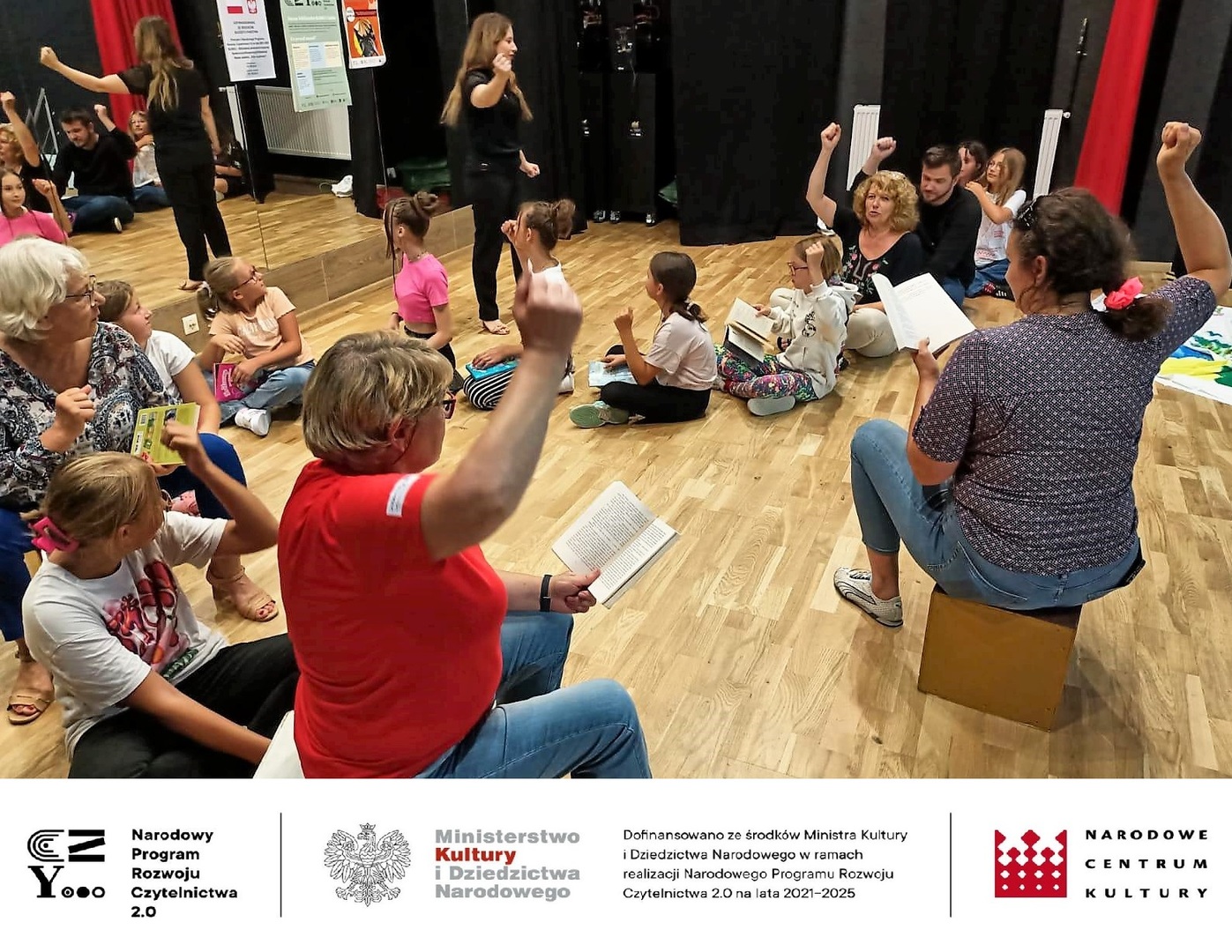 W zajęciach wzięły udział dzieci z miejscowej szkoły podstawowej oraz bibliotekarze i przedstawiciele naszych partnerów. Na początku spotkania uczniowie zapoznali się ze współczesnymi i popularnymi formami wypowiedzi artystycznej, tj. happening, performance, flash mob i teatr uliczny. Po części teoretycznej rozpoczęła się bardzo aktywna część warsztatowa. Dzieci wspólnie z dorosłymi tworzyły scenariusze wydarzeń zainspirowanych książkami i czytaniem. Tak powstał m. in. „pociąg do czytania”, utworzony z siedzących na scenie uczestników, z których każdy czytał swoją książkę. Było to przerywane gwizdem lokomotywy w wykonaniu osoby, która siedziała na początku składu.