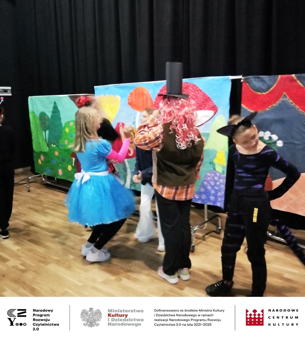 W czasie szkolenia „Kreatywne formy pracy z książką” powstał scenariusz performanceu do książki „Alicja w Krainie Czarów”, a w trakcie warsztatów uczestnicy podjęli się zadania realizacji tego pomysłu. Powstała scenografia z trzech dużych płócien, na których namalowane zostały sceny, las z króliczą norą, Kraina Czarów oraz sala balowa. Stroje wykonają rodzice występujących dzieci. Największym wyzwaniem było ułożenie choreografii do tańca, za pomocą którego dzieci miały opowiedzieć historię Alicji. Pracy nad tym, ale jednocześnie zabawy i nauki, było bardzo dużo, ale efekt końcowy okazał się niesamowity. Zarówno wśród bibliotekarzy jak i dzieci już w trakcie warsztatów narodziły się pomysły na podobne działania z innymi tekstami książek.