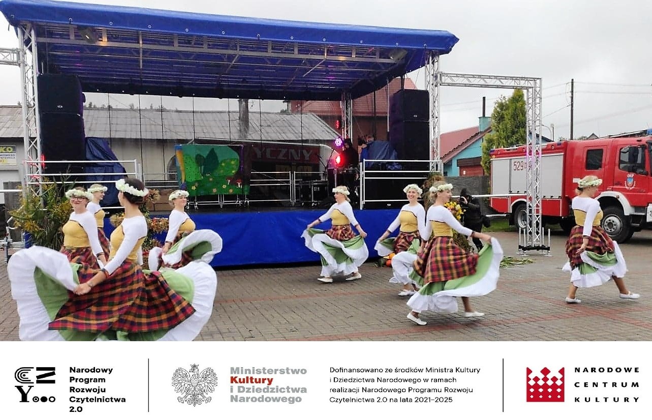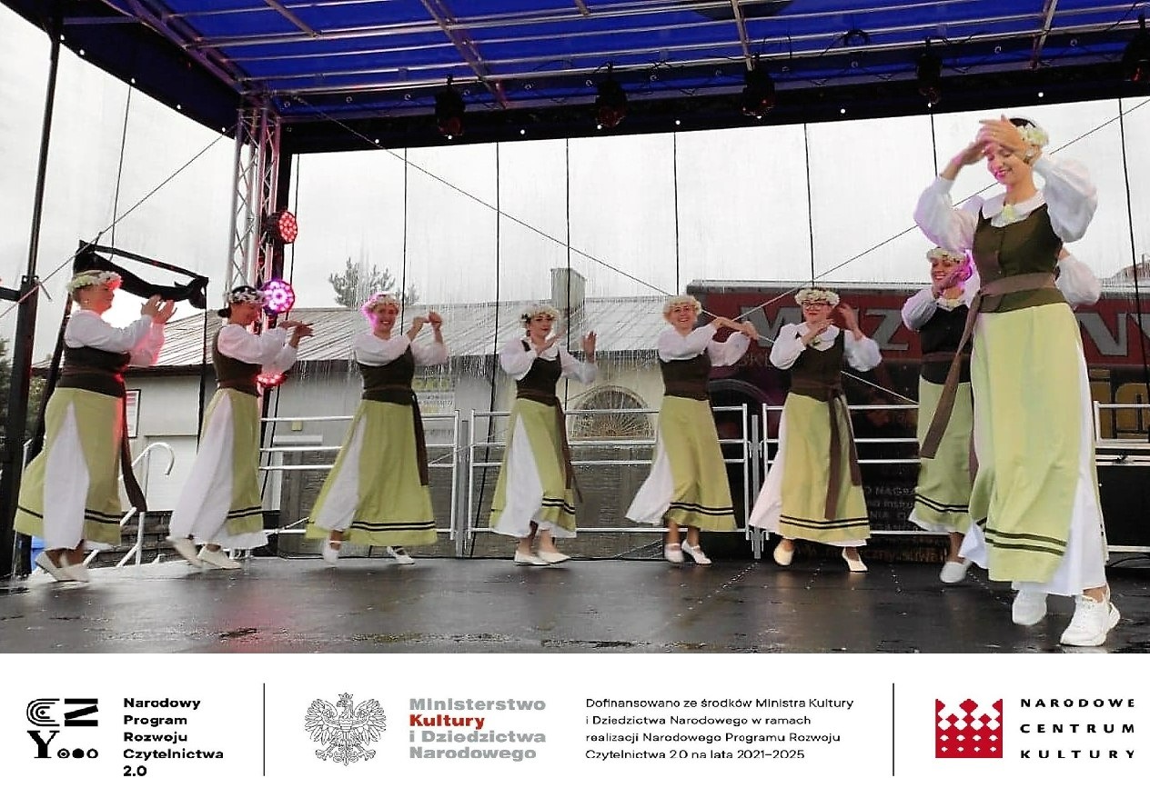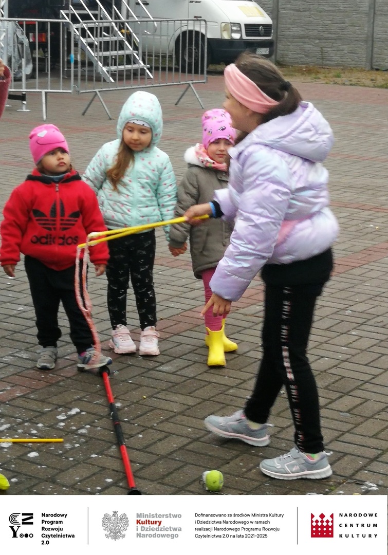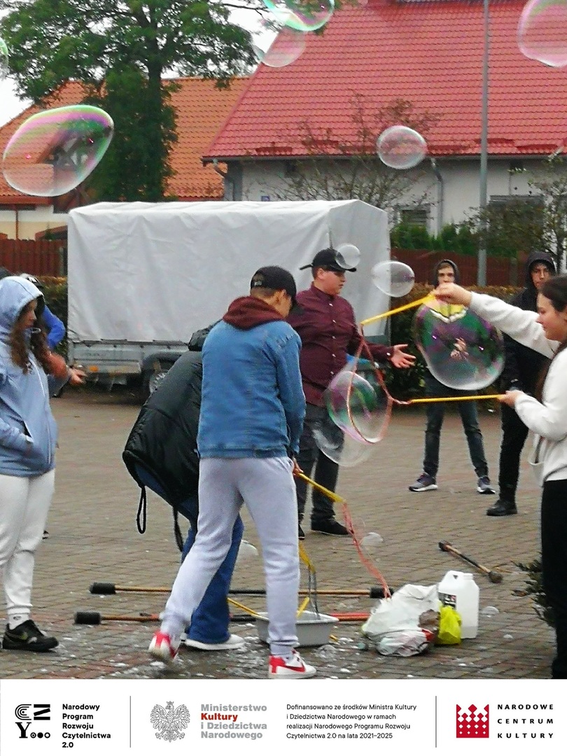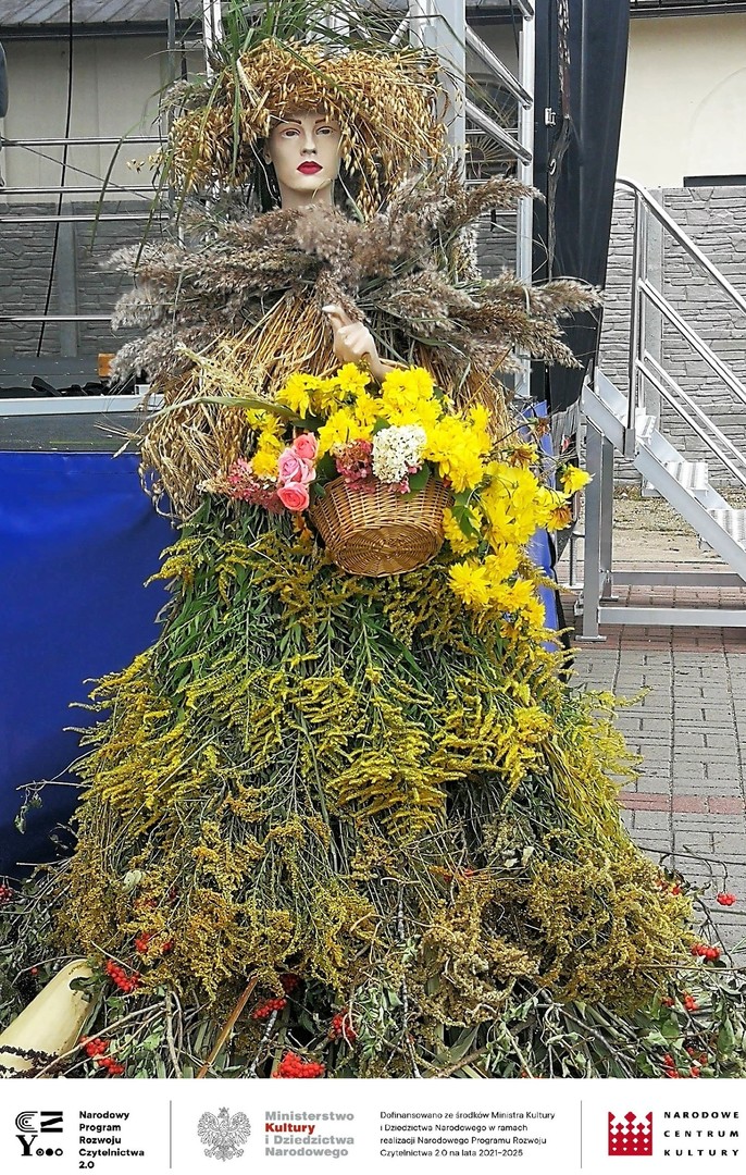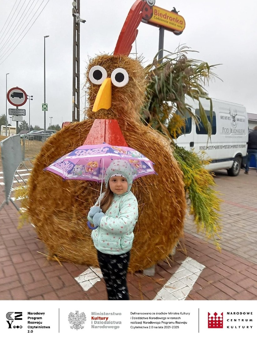 W trakcie całej imprezy obecnym na placu towarzyszyli kolorowi szczudlarze i kuglarze, którzy zabawiali publiczność, w tym dzieci. Uczyli między innymi żonglerki piłeczkami, kręceniem poi i kijami, dzieci bawiły się robieniem ogromnych baniek mydlanych i nie przeszkadzał im deszcz i chłód. Ze względu na złe warunki pogodowe musieliśmy przenieść do budynku Gminnego Centrum Kultury wystawę prac plastycznych, której towarzyszyła dużych rozmiarów wierzba z czającym się wewnątrz diabeł, często przytaczaną postacią z opowieść naszego regionu. Praca powstała podczas warsztatów plastycznych dla seniorów, które odbyły się również w ramach projektu „Pole wyobraźni” dofinansowanego ze środków Ministra Kultury i Dziedzictwa Narodowego w ramach realizacji Narodowego Programu Rozwoju Czytelnictwa 2.0 na lata 2021-2025.