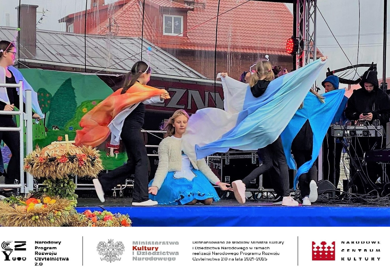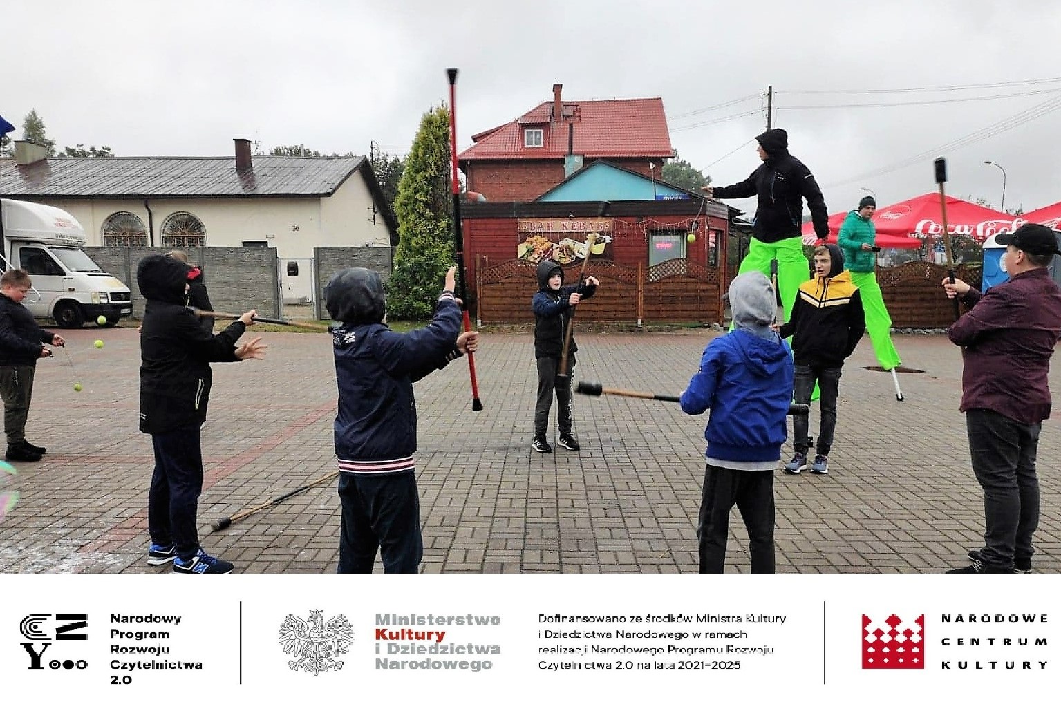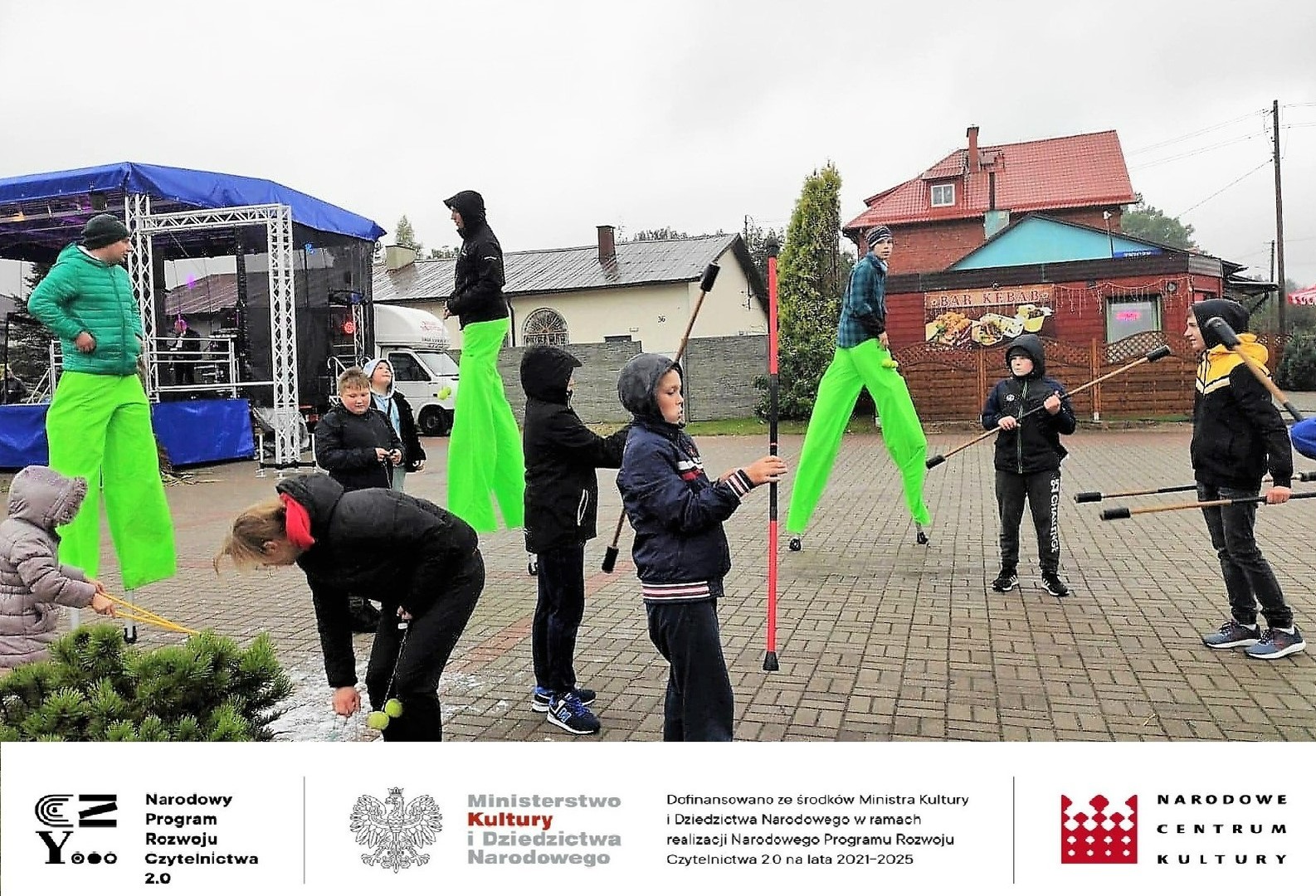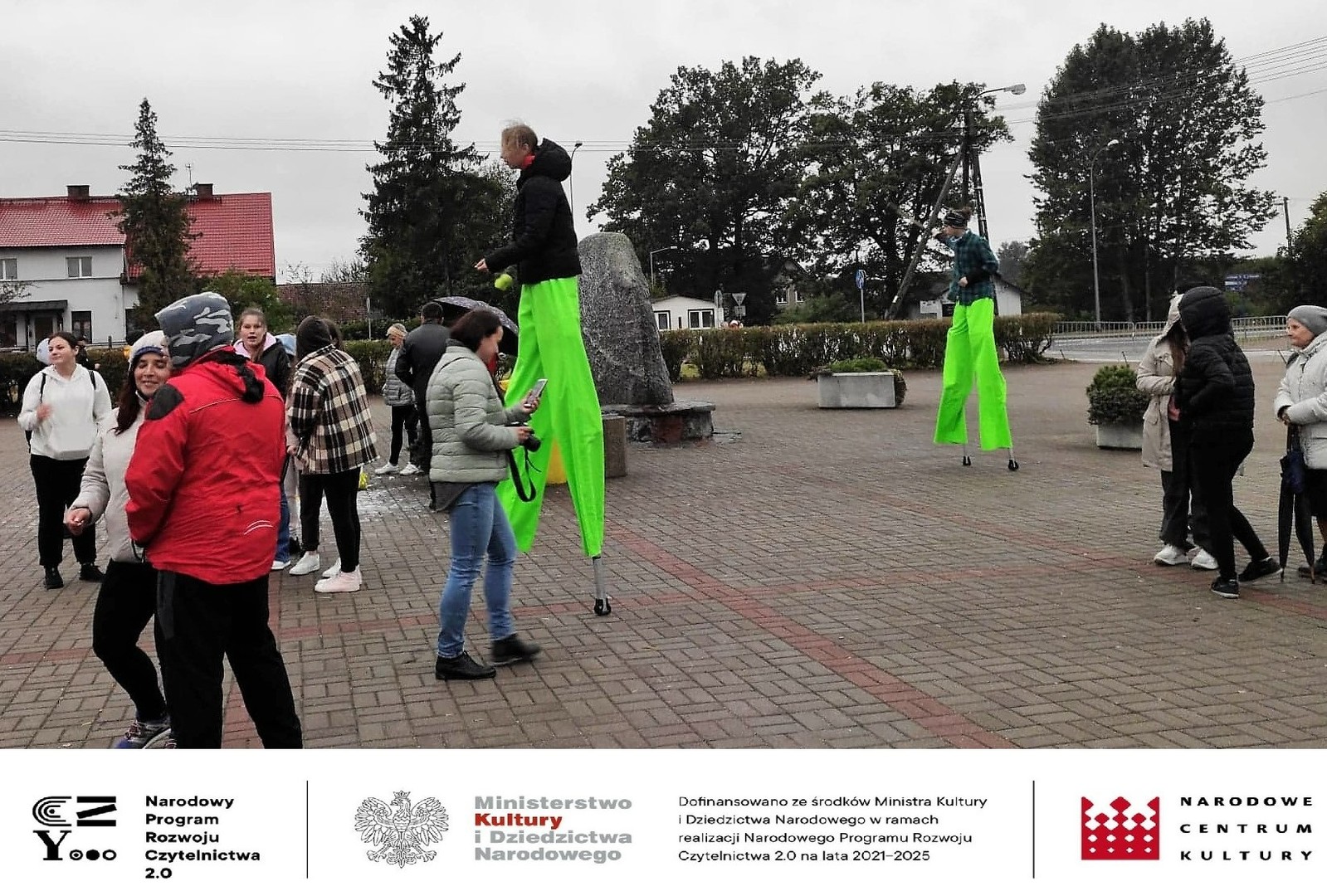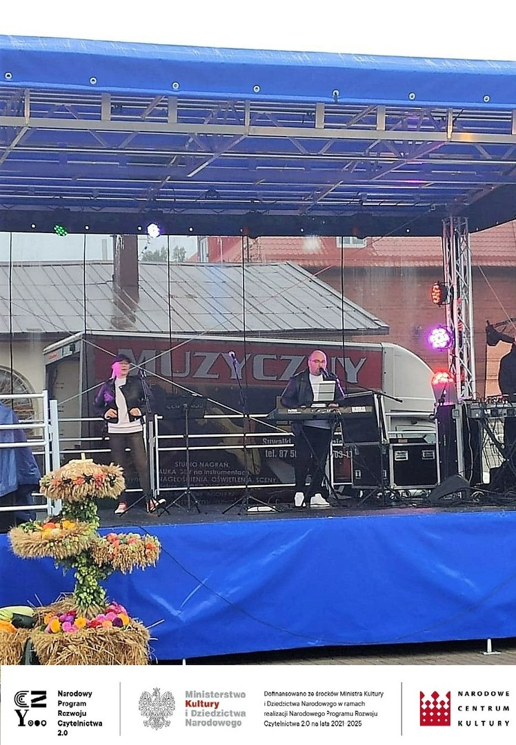 W trakcie całej imprezy obecnym na placu towarzyszyli kolorowi szczudlarze i kuglarze, którzy zabawiali publiczność, w tym dzieci. Uczyli między innymi żonglerki piłeczkami, kręceniem poi i kijami, dzieci bawiły się robieniem ogromnych baniek mydlanych i nie przeszkadzał im deszcz i chłód. Ze względu na złe warunki pogodowe musieliśmy przenieść do budynku Gminnego Centrum Kultury wystawę prac plastycznych, której towarzyszyła dużych rozmiarów wierzba z czającym się wewnątrz diabeł, często przytaczaną postacią z opowieść naszego regionu. Praca powstała podczas warsztatów plastycznych dla seniorów, które odbyły się również w ramach projektu „Pole wyobraźni” dofinansowanego ze środków Ministra Kultury i Dziedzictwa Narodowego w ramach realizacji Narodowego Programu Rozwoju Czytelnictwa 2.0 na lata 2021-2025.